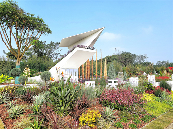 盤旋而上的機身,巧妙融合了“空港花谷”和“夢想之翼”兩個主景,既突出了簡陽的城市名片,又呼應了花展的行業屬性。