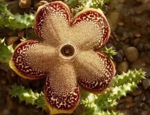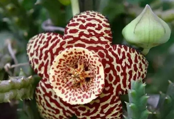 大花犀角,蘿藦科豹皮花屬。基部分枝,有齒狀突起,灰綠色的枝干,形如犀牛角。因其邊緣密而生長著細毛,略微帶刺的棱角,具有一定的臭味,其傳宗接代以惡臭引誘蒼蠅授粉,故又名臭肉花。其自身也富含汁液,人體皮膚接觸會出現(xiàn)過敏等癥狀。