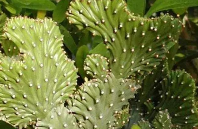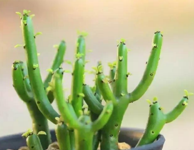 麒麟掌屬大戟科,原產(chǎn)于印度東部干旱、炎熱、陽光充足的地區(qū)。它的全株含有白色的劇毒莖汁,會令皮膚出現(xiàn)紅腫、瘙癢等過敏癥狀,濺入眼中可致失明,誤食還可能造成嚴重中毒。