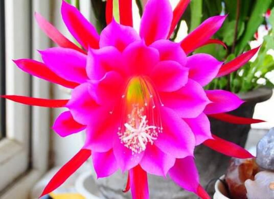 仙人指:12-2月開放,花瓣纖細、多層,開花時花瓣翻折