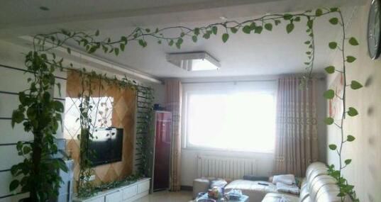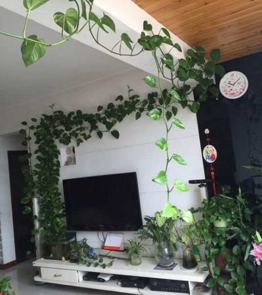 這有點繞梁一周的感覺了,夏天一定很清新,連電視墻都省了,從圖片上可以看出這顆綠蘿是水養的