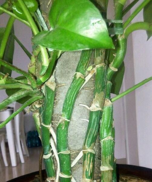 看圖這是一顆土養的綠蘿,下面還是綠蘿柱的樣子,可以媲美窗簾了,同樣的做了牽引