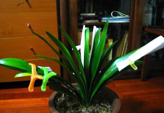 1、機械整形:用小夾子將已經歪出的葉片與相鄰的正位葉片夾在一起(注意所夾部位要墊上軟紙,以防夾傷葉片),經過一段時間后歪出的葉片可基本恢復正位。另一種是將兩根長度、粗細相同的竹條彎成弓形,然后順著君子蘭扇形葉片的兩邊,分別插進花盆內緣,形成夾勢,力度不足時可在兩竹條之間系上細繩。
