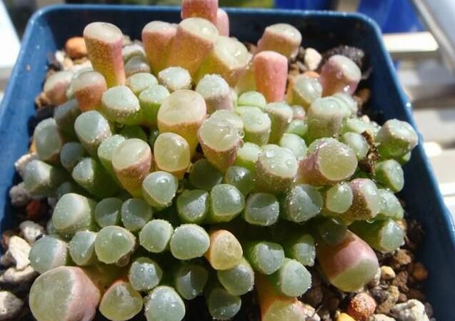推薦理由:風鈴玉葉窗特別透明,價格大約為5元一頭,雖然看起來很嬌嫩,但是它要比生石花等其他番杏品種生命力強的多,度夏比較容易,只要適當遮陰,每半月一次適當的“滴”一些多菌靈溶液就可以了。養得好的風鈴玉葉窗特別透亮,猶如頭頂一個明亮的綠燈泡一般。