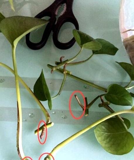1、綠蘿根莖上有灰褐色花骨朵,看清楚那就是綠蘿的落根。順著根的位置用剪刀斜著剪下,不要傷到幼小的根